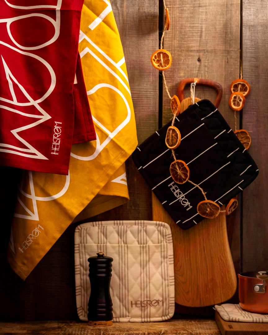 Vi tilbyr et unikt utvalg av kjøkkentekstiler fra Hellstrøm som kombinerer kvlaitet, praktisk bruk og livlige farger for å skape en inspirerende atmosfære på kjøkkenet ditt!