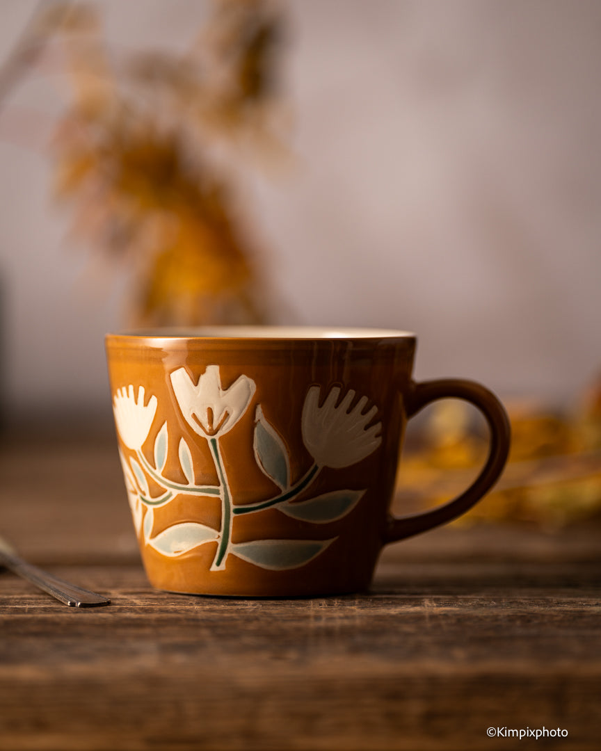 Lekker kopp i keramikk og hånd-dekorert med retrokunstverk av blomster. Små og forskjellige fargedetaljer kan forekomme.