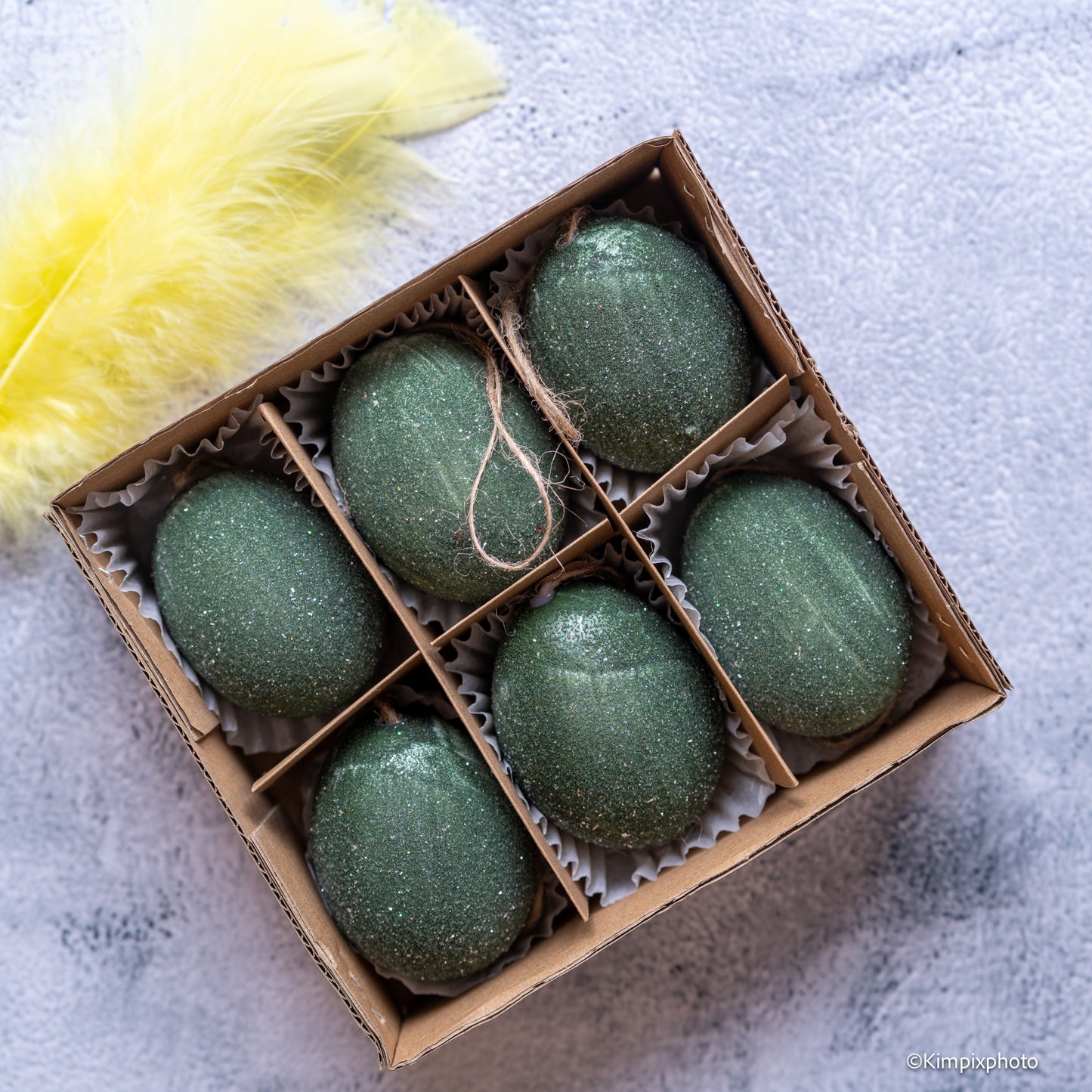 Mørkegrønne påskeegg med glitter for å henge i påskeriset.